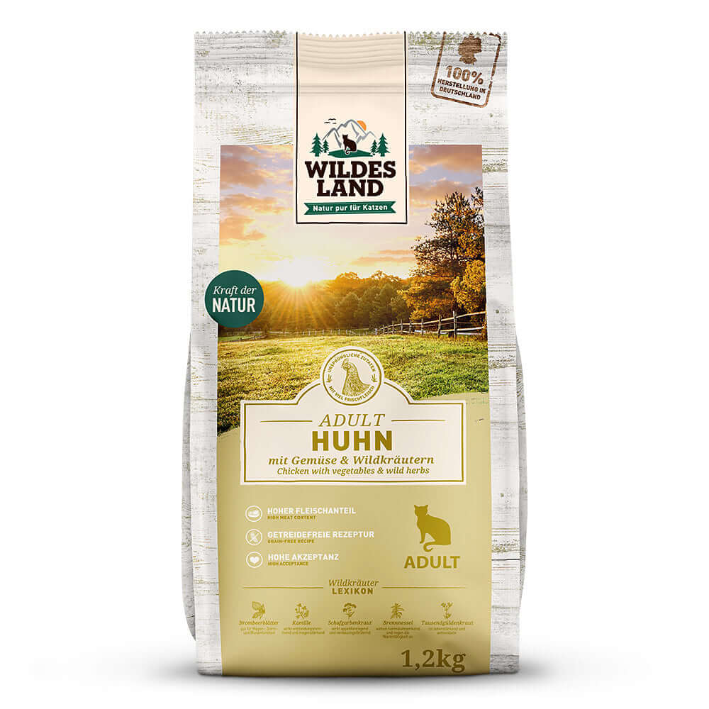 Das Trockenfutter Huhn von Wildes Land hat einen hohen Fleischanteil und wird ergänzt durch wertvolle Zutaten wie Amaranth, Erbsen, Wildkräuter und Leinsaat. Mit diesem 1,2-kg-Sack Trockenfutter bekommt Deine Samtpfote nur pure Natur in den Napf.