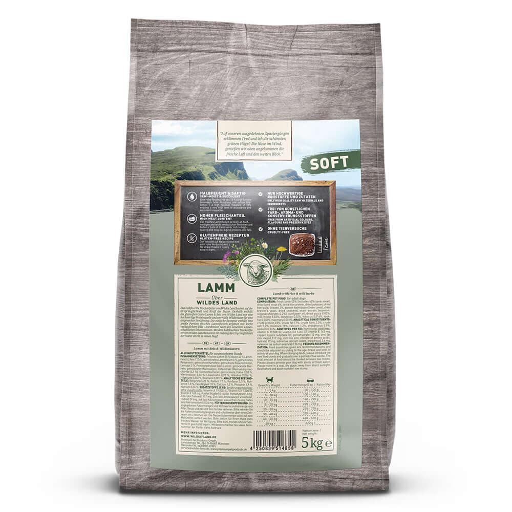 Das Softfutter von Wildes Land beinhaltet viel frisches Lamm und getrocknetes Lammfleisch von insgesamt 61%, dessen Rezeptur in einer feinen und artgerechten Komposition mit glutenfreiem Reis und Wildkräutern abgerundet wird. Die hohe Restfeuchte von 18 % und der hohe Anteil an frischem Lamm sorgt für eine besonders hohe Akzeptanz und saftige Kroketten.