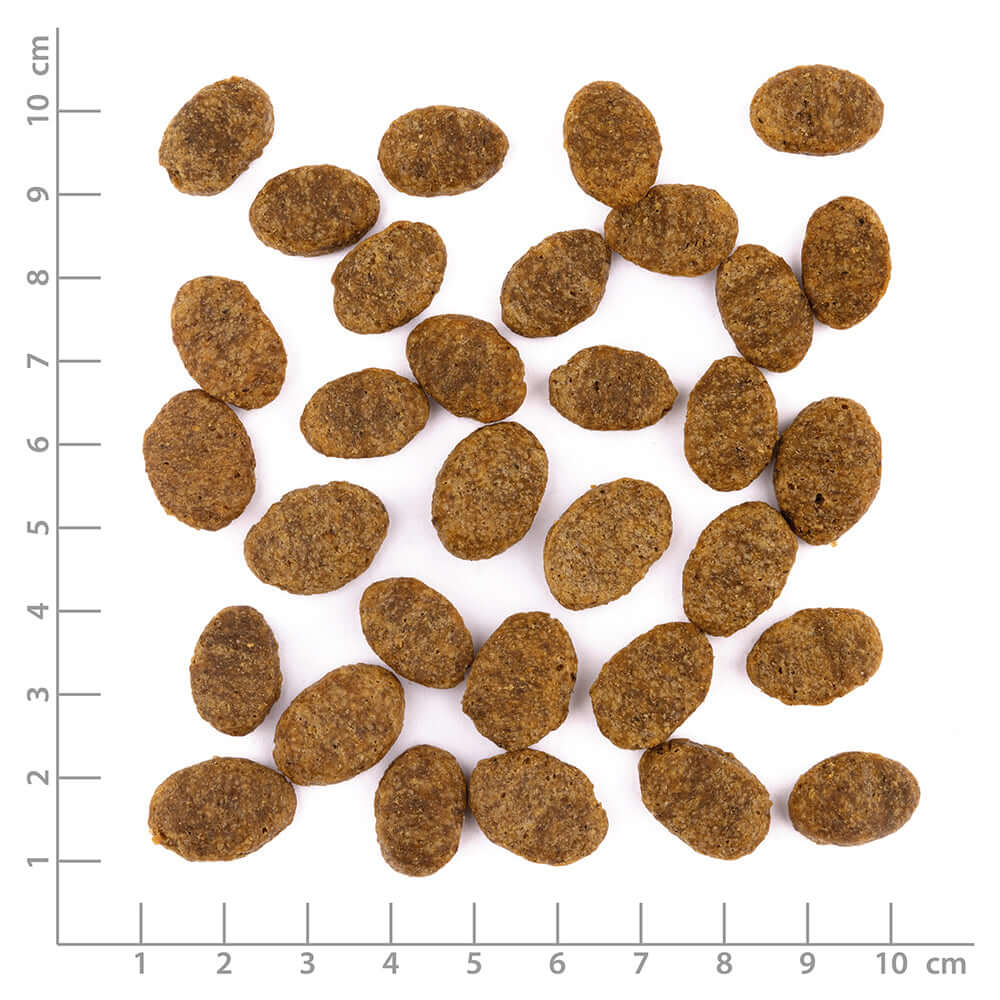 Die Rezeptur wird durch hochwertiges Pflanzen- und Insektenprotein ergänzt, wodurch wir den Gesamtfleischanteil gegenüber herkömmlichen Rezepturen reduzieren können. Durch diesen ökologischeren Fleischanteil reduzieren wir die Landnutzung, den Wasserverbrauch und die Emissionen von Treibhausgasen (CO2e). Dadurch wird mehr Tierwohl gefördert und der CO2-Pfotenabdruck vermindert. Der Anteil an frischem Tierwohl-Huhn in der Rezeptur sorgt zudem für eine hohe Akzeptanz.