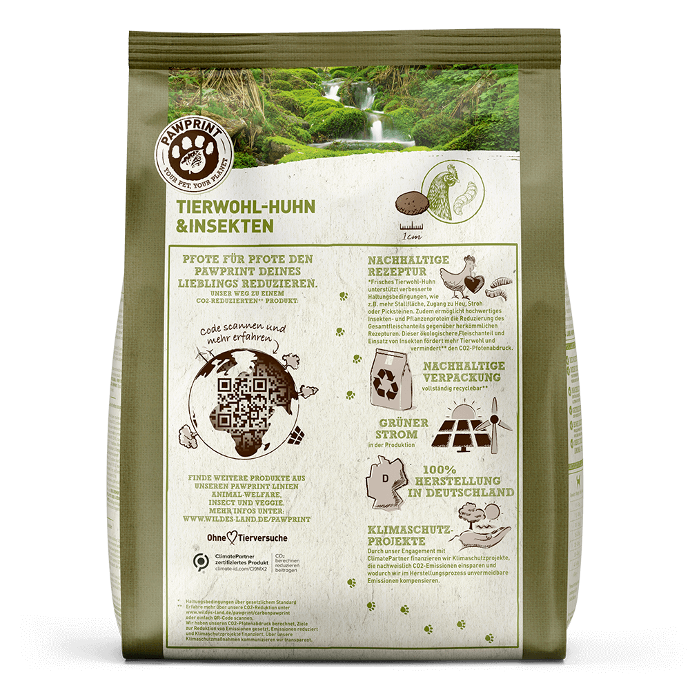 Unsere Bemühungen zur Reduzierung von Treibhausgasemissionen (CO2e) gehen jedoch über die Rezeptur hinaus. Wir setzen auf vollständig recyclebare Verpackungen, grünen Strom in der Produktion und die Herstellung in Deutschland, welche kurze Transportwege in unser Lager ermöglicht. Zudem kompensieren wir unvermeidbare Emissionen durch unser Engagement in Klimaschutzprojekte. Mit Wildes Land PawPrint wählst Du nicht nur das Beste für Deinen Hund, sondern auch für unseren Planeten.