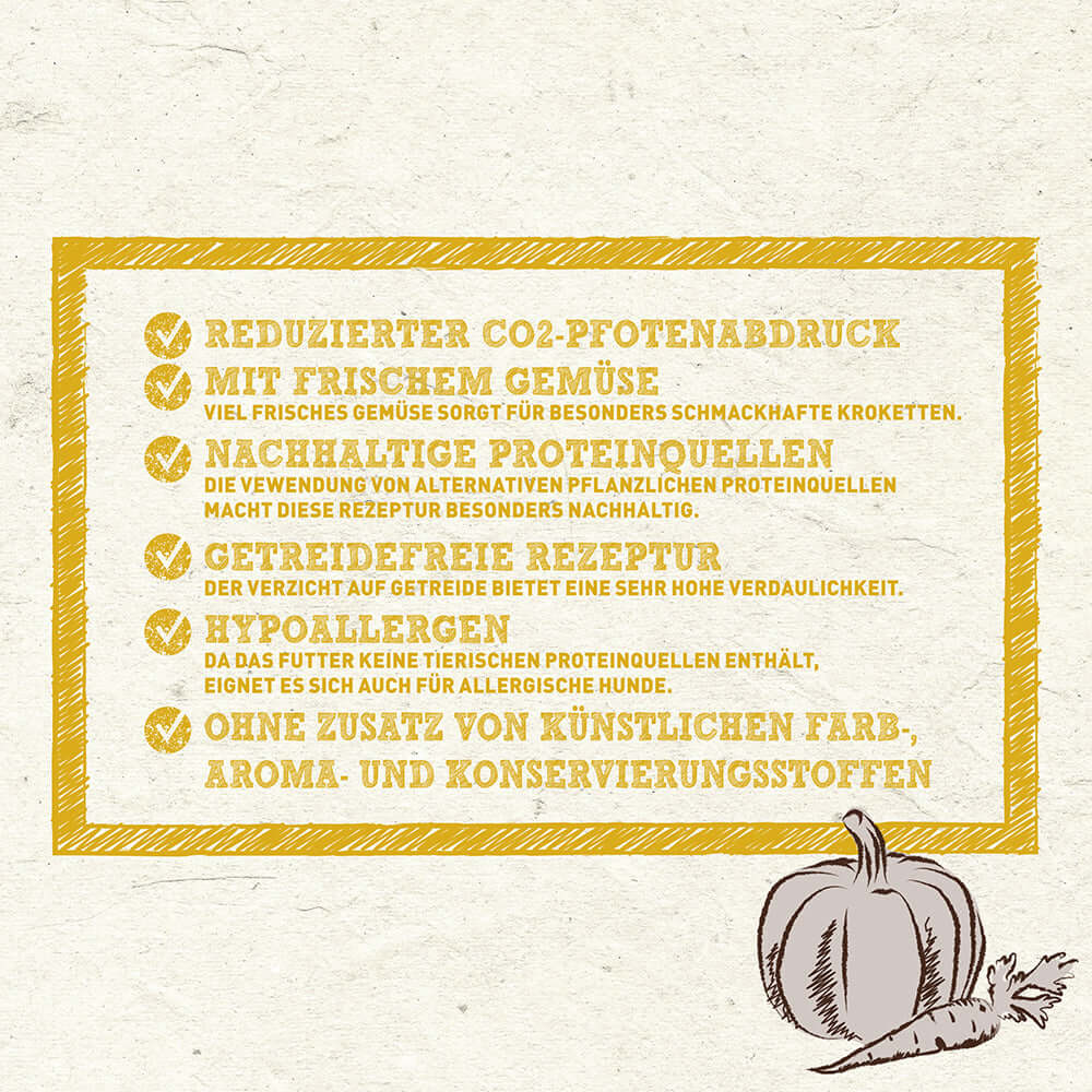 Da Hunde sogenannte Omni-Carnivoren sind, können sie von Natur aus sowohl Fleisch als auch pflanzliche Nahrung fressen und verdauen. Daher ist diese Rezeptur auf Basis von hochwertigem pflanzlichem Protein ein besonders nachhaltiger Eiweißlieferant. Viel frisches Gemüse sorgt dabei für besonders schmackhafte Kroketten.