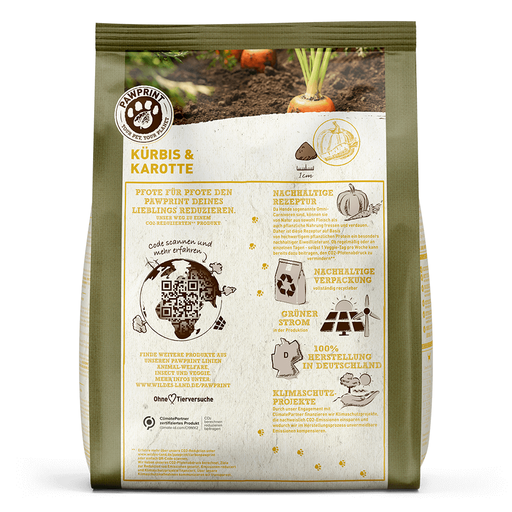 Unser vegetarisches und getreidefreies Trockenfutter mit Kürbis und Karotten, frischem Gemüse und Wildkräutern ist ein nachhaltiger Eiweißlieferant und enthält alle Nährstoffe, die Dein Hund für ein gesundes Leben braucht.