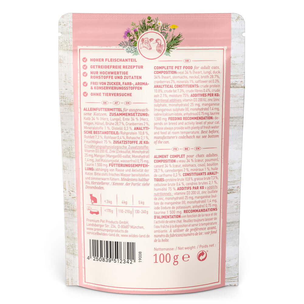 Wildes Land Katze - Kalb und Ente - 100g ist auf Lager und wird versandt, sobald es wieder verfügbar ist