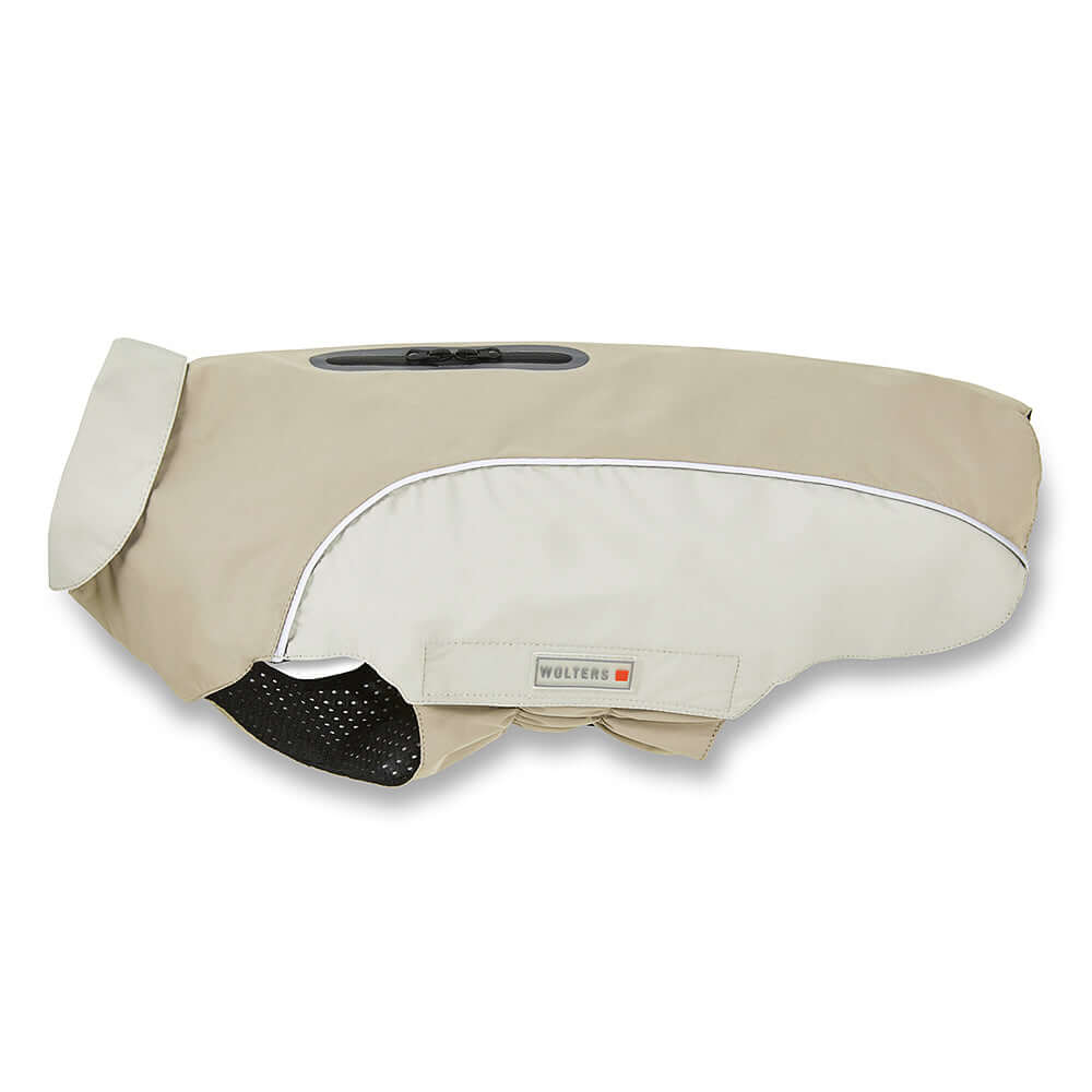 Praktisch für Geschirrträger: Dank einer in den Stoff eingeschweißten, wasserdichten Reißverschlussöffnung kann der Vierbeiner durch den Mantel am Geschirr ganz unkompliziert angeleint werden.